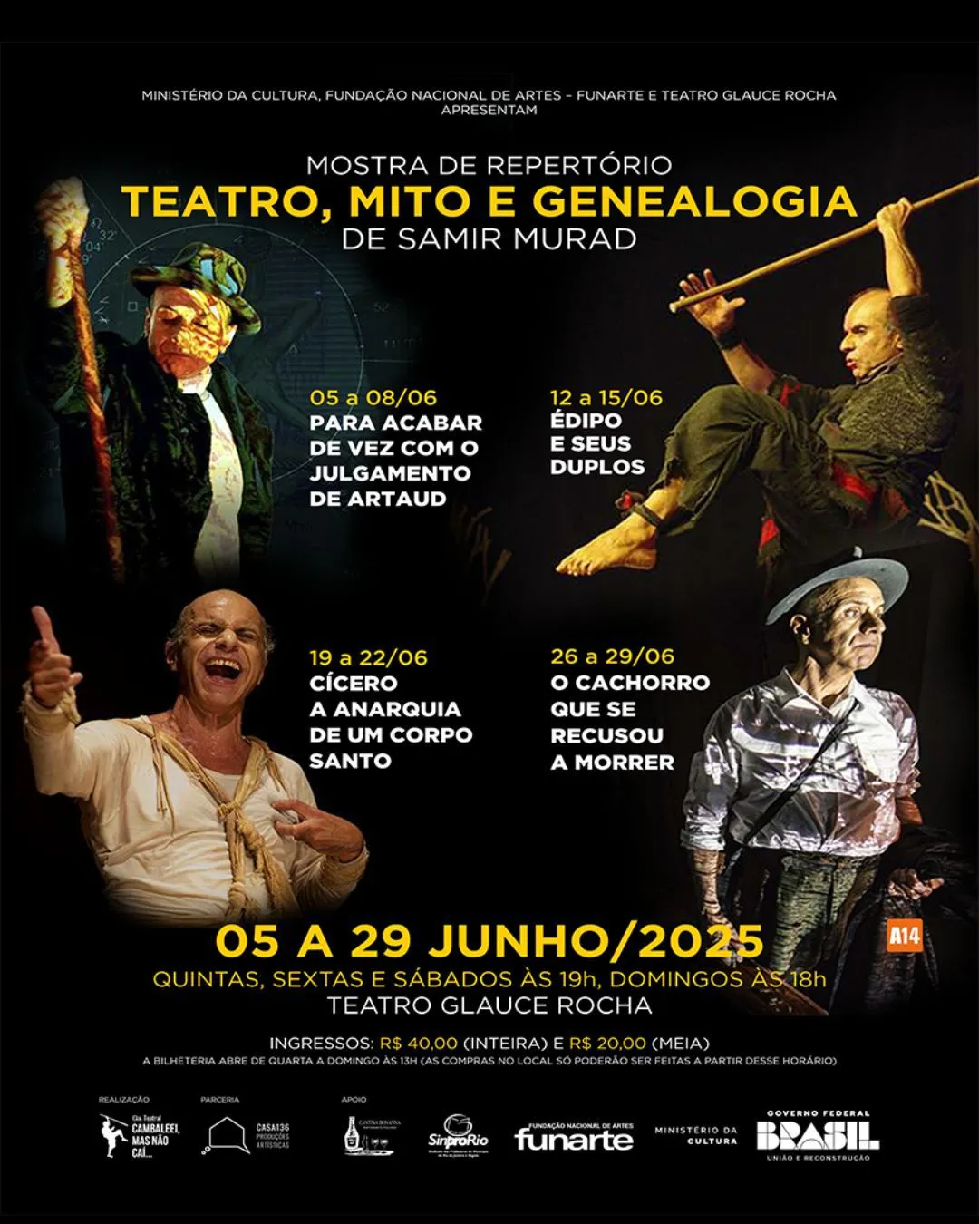 Um panorama da produção teatral dos últimos 25 anos de carreira do premiado ator Samir Murad. Essa é a proposta da mostra “Teatro, Mito e Genealogia” da “Cia.Cambaleei, mas não caí…”, que acontece dentro do Programa Funarte Aberta. A mostra, que dá foco para quatro personagens míticos, ocupa no mês de junho o palco do Teatro Glauce Rocha, no centro do Rio, que pertence à Fundação Nacional das Artes - FUNARTE. Os quatro monólogos serão apresentados um a cada semana, de quintas a sábados (às 19h) e domingos (às 18h): “Para Acabar de Vez com o Julgamento de Artaud” (5 a 8/jun); “Édipo e Seus Duplos” (12 a 15/jun); “Cícero - a Anarquia de um Corpo Santo” (19 a 22/jun); e “O Cachorro que se Recusou a Morrer” (26 a 29/jun).
